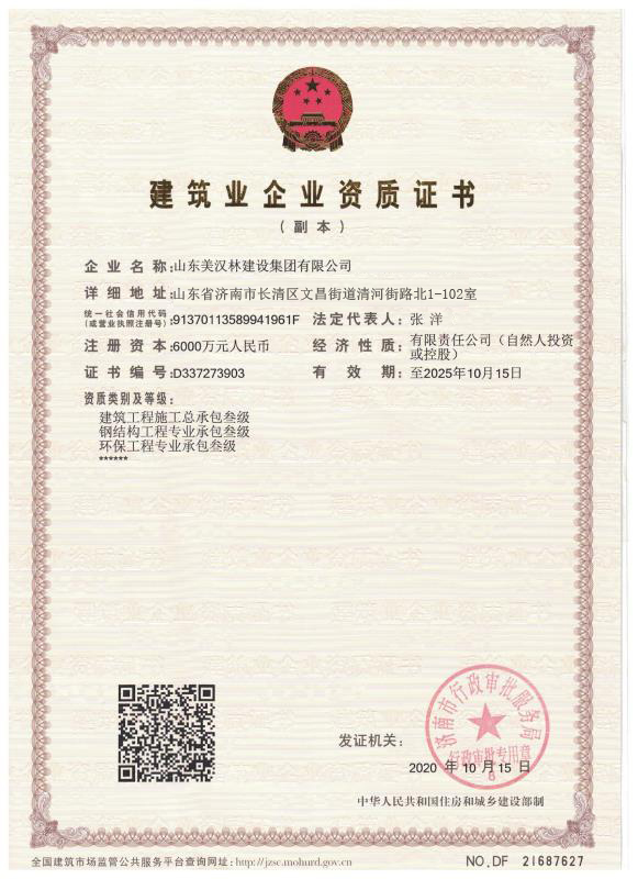 2020年10月15日,美汉林集团获得《建筑业企业资质证书》