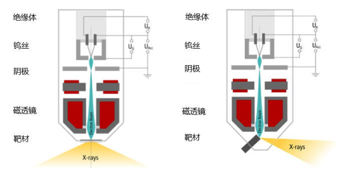 从靶材的形状和角度分类,X射线管分为反射式和透射式。反射式靶面与入射电子束形成一定倾斜角度,具有较大的散热体积,可以承受较高电压的加速电子;透射式靶是很薄的一层薄膜,靶面与入射电子束垂直,可以获得更小的焦点尺寸和更大的辐射角度。 透射式靶是一层薄膜,其靶面与入射电子束垂直。这种设计可以获得更小的焦点尺寸和更大的辐射角度。透射式靶适用于需要高分辨率成像的场景,例如:材料科学中的微焦点X射线成像,采用透射式靶可用于研究材料的微观结构和缺陷。